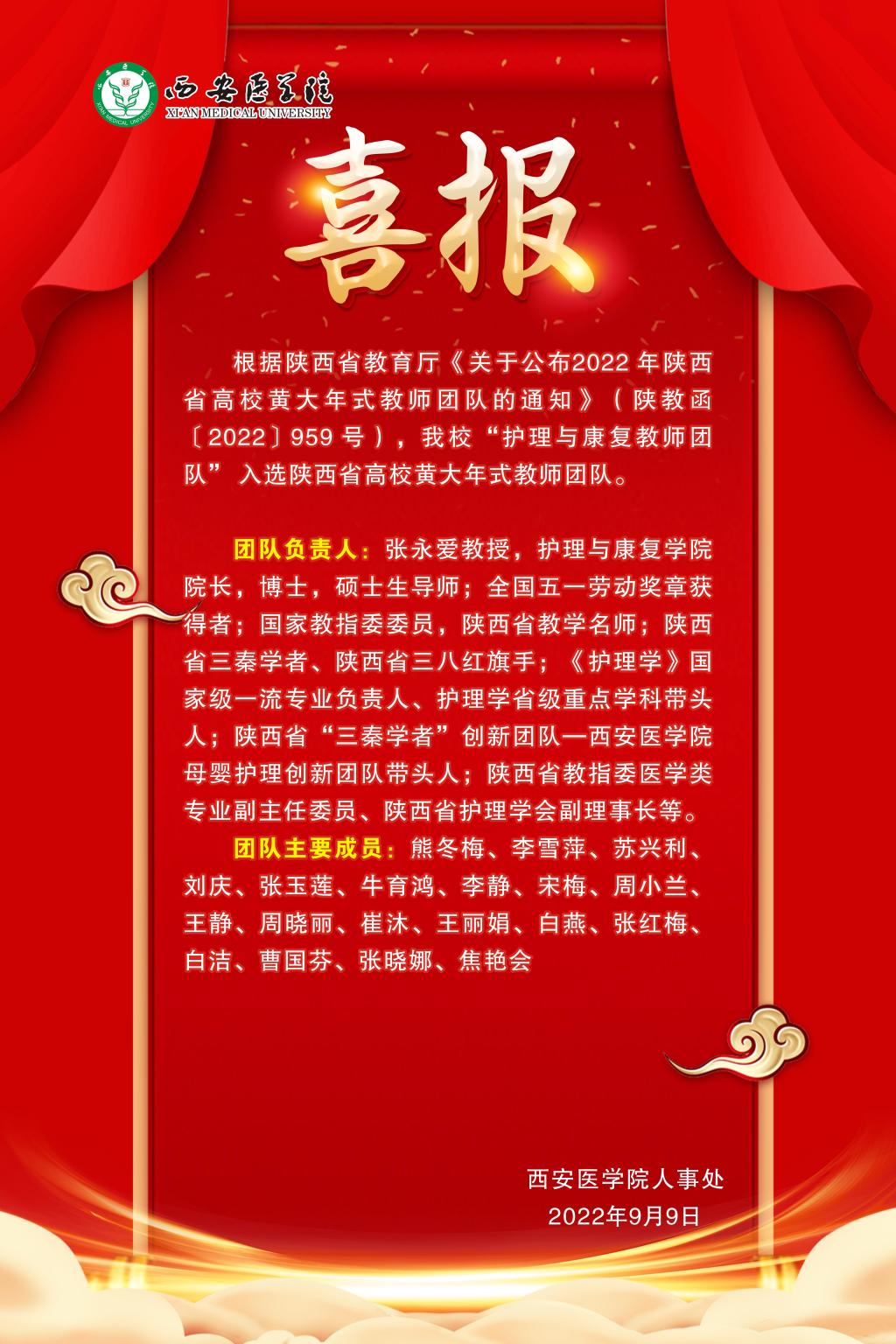 近日,陕西省教育厅印发《关于公布2022年陕西省高校黄大年式教师团队的通知》,由我校护理与康复学院院长张永爱教授作为负责人申报的“williamhill官网护理与康复教师团队”入选陕西省高校黄大年式教师团队。