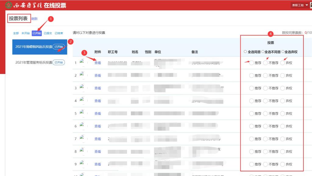 3.本次投票设计有“推荐”、“不推荐”、“弃权”三种选择,教职工必须在每位候选人的投票栏中都选择投票结果,否则系统无法点击“提交”。